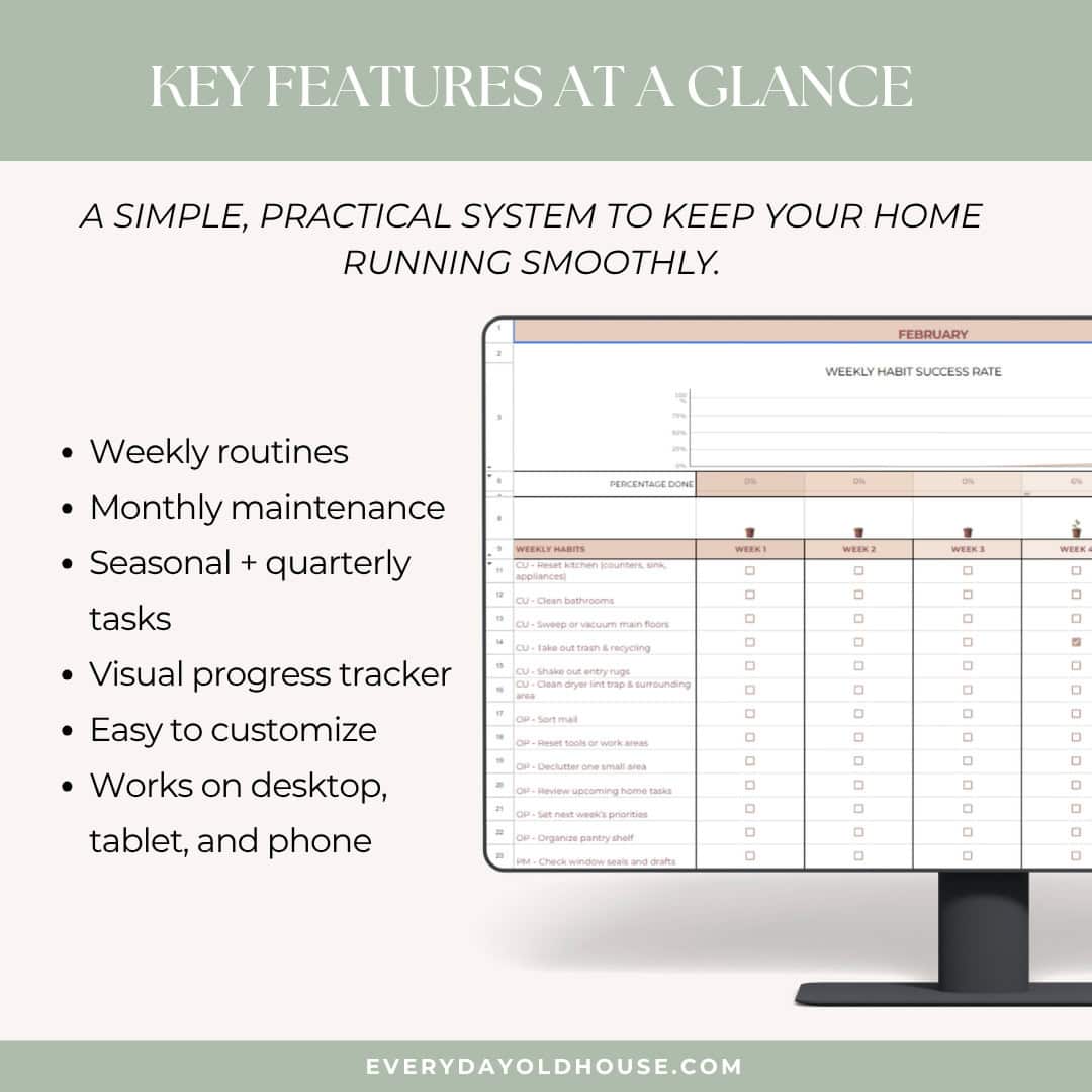 Simple, practical system home management habit tracker to help you stay on top of your home — without feeling overwhelmed. Weekly routines, monthly maintenance, seasonal guidance, and a visual progress tracker all in one clean, easy‑to‑use Google Sheet.